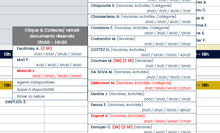 A voir, on ne peut pas les inclures dans le planning de la journée vu que se sont des heures indépendantes des emploi du temps (EDT) annuels des agents. Donc la case 19h-20h n’est pas alimenté par une liste d’agents